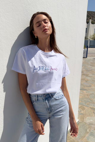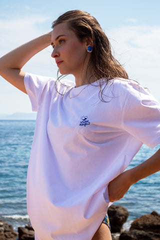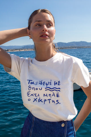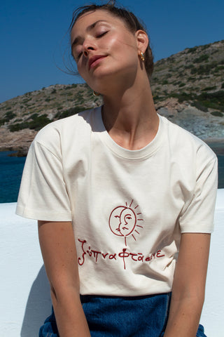 The moment for the beach, the island, the trip, the ferry has arrived. That fleeting urge, when you’re still in the city but already longing for a swim, for salt, for stories shared by the sea. That’s when you reach for an oversized tee that carries you there. Our new T-shirt collection is screen printed on 100% organic cotton with messages that feel like summer. Soft, airy, easy to wear on its own at the island or layered back in the city, these tees are made to travel with you.